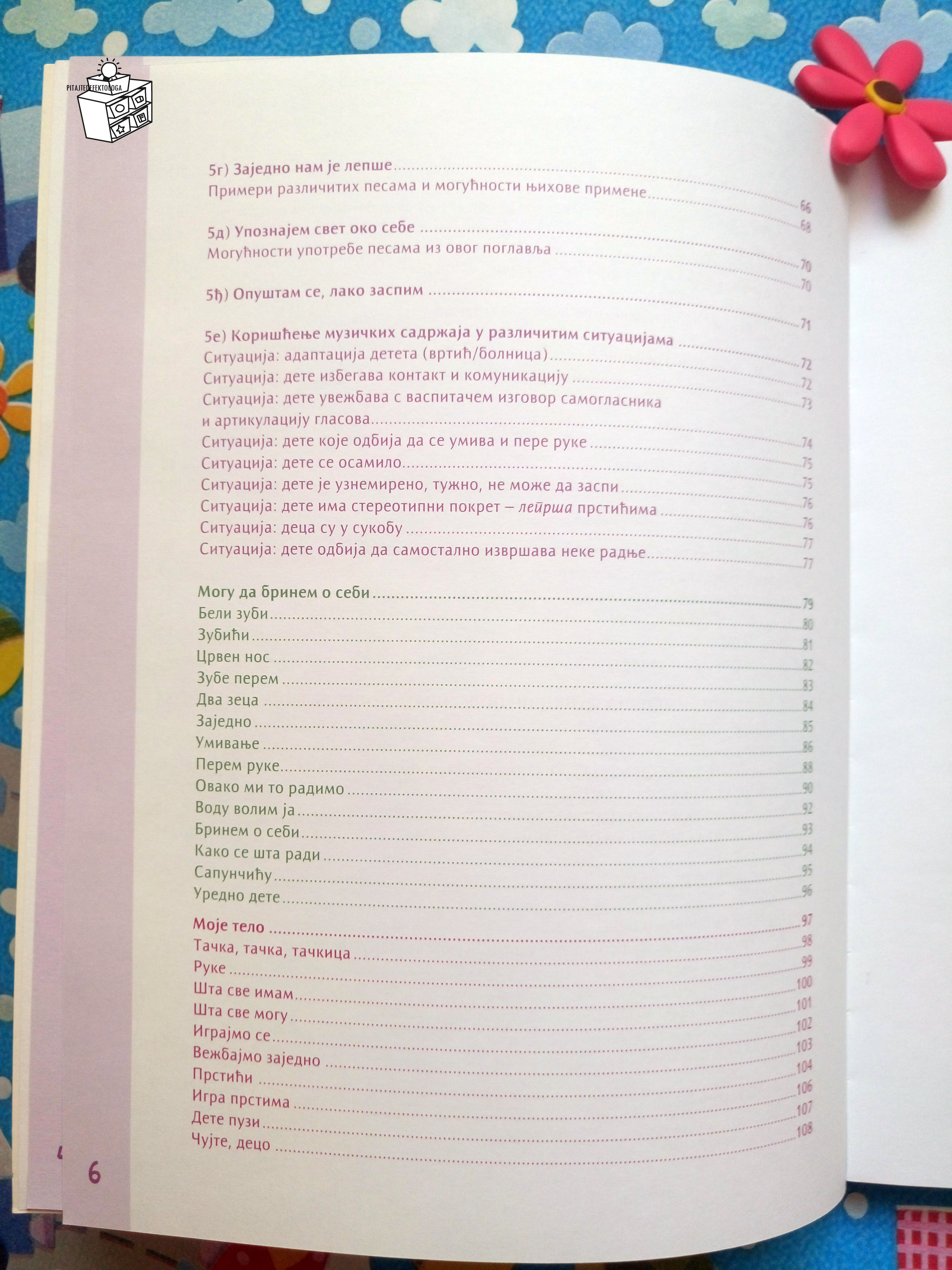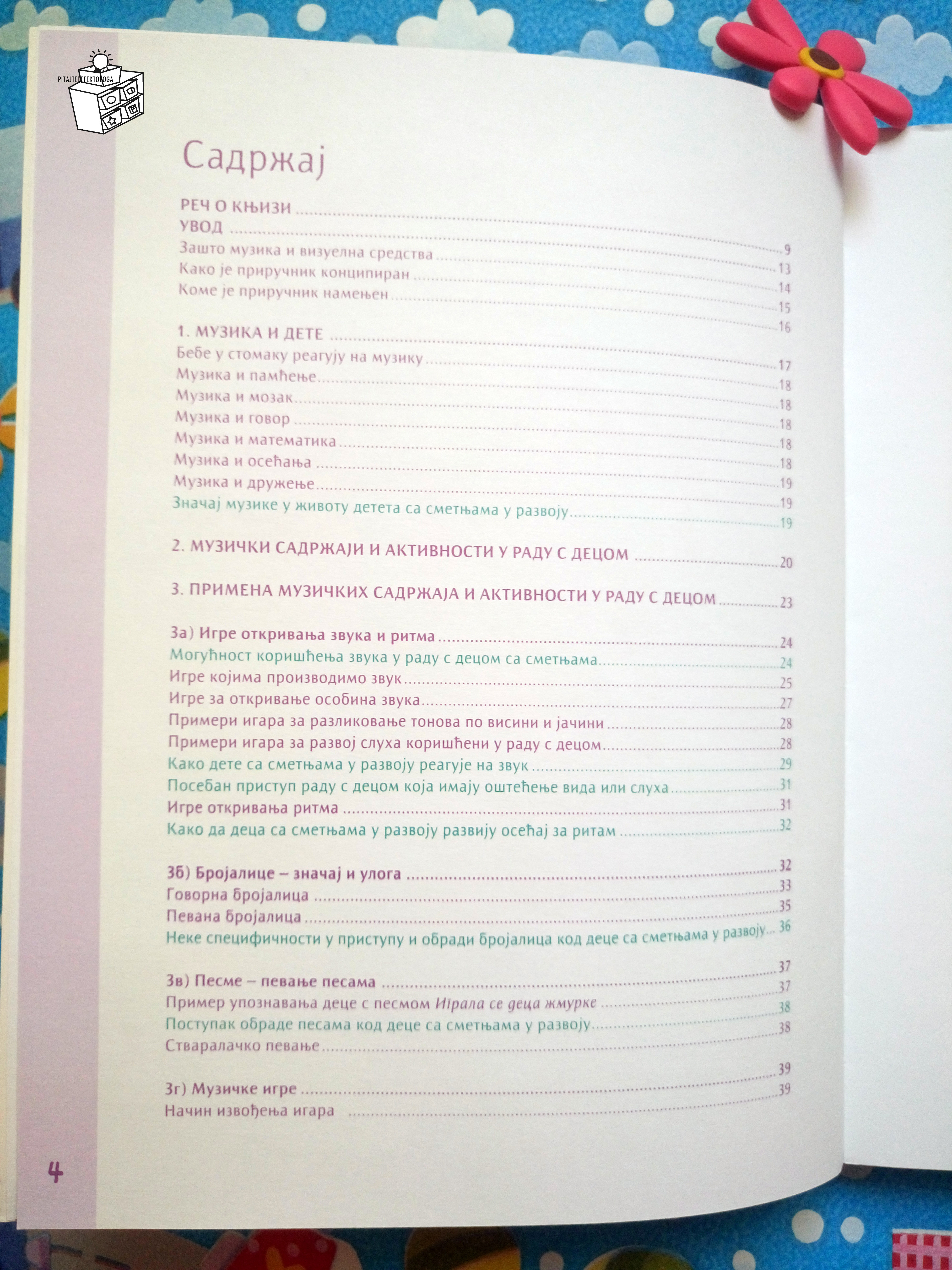 - PRIMENA MUZIČKIH SADRŽAJA I AKTIVNOSTI U RADU SA DECOM – deo priručnika koji ima sedam pogrupa, a to su igre otkrivanja zvuka i ritma, brojalice, pesme, muzičke igre, muzičke dramatizacije, slušanje muzike, instrumenti, ali i poseban deo koji se odnosi na specifičnosti pristupa deci sa smetnjama u razvoju. Svaka od podgrupa je objašnjena uz odgovore na pitanja šta? kako? zašto? i to uz praktične, jednostavne primere (za koje da biste ih izveli nije neophodno imati muzičku edukaciju) što je jedna od prednosti ove knjige.