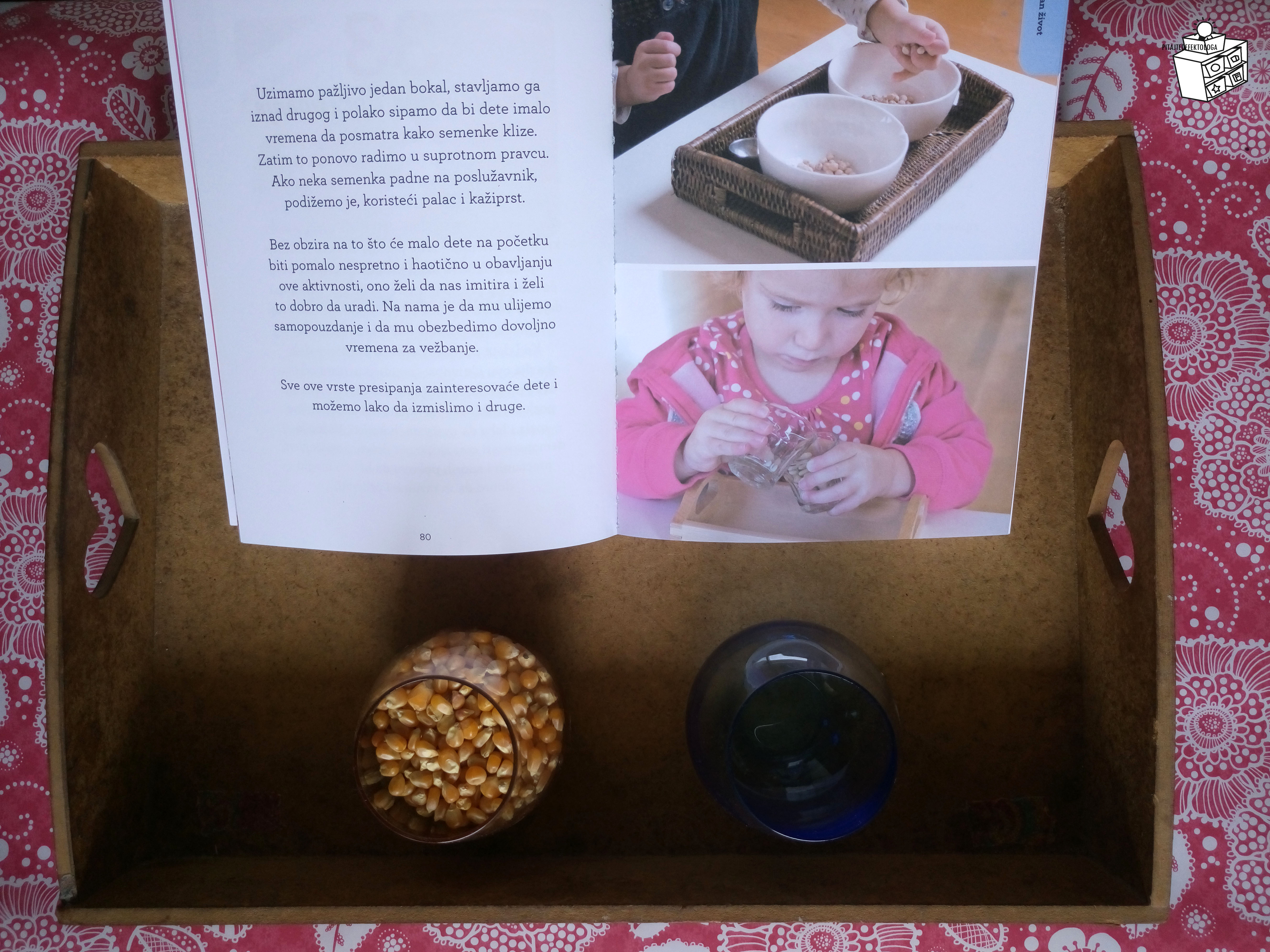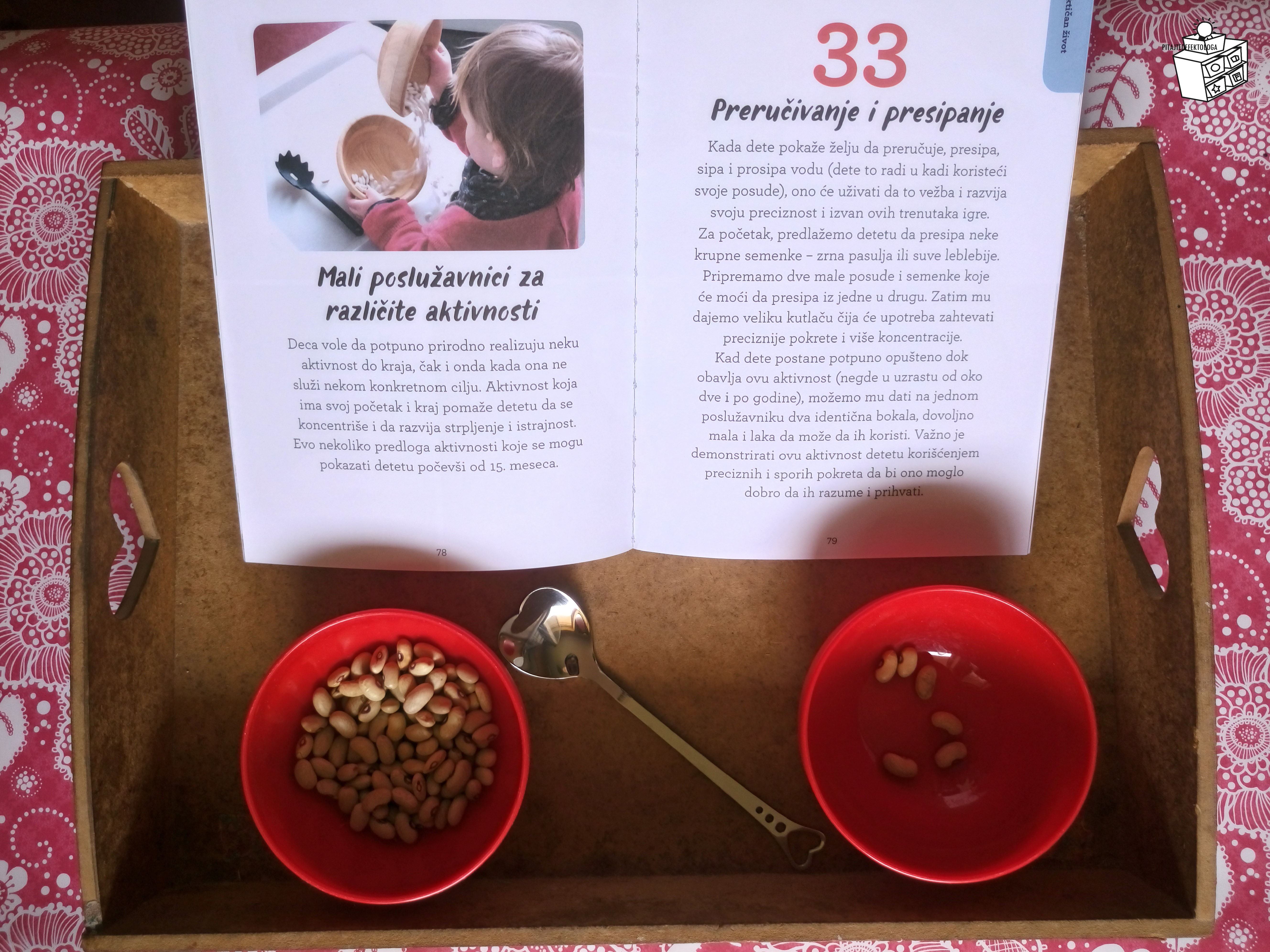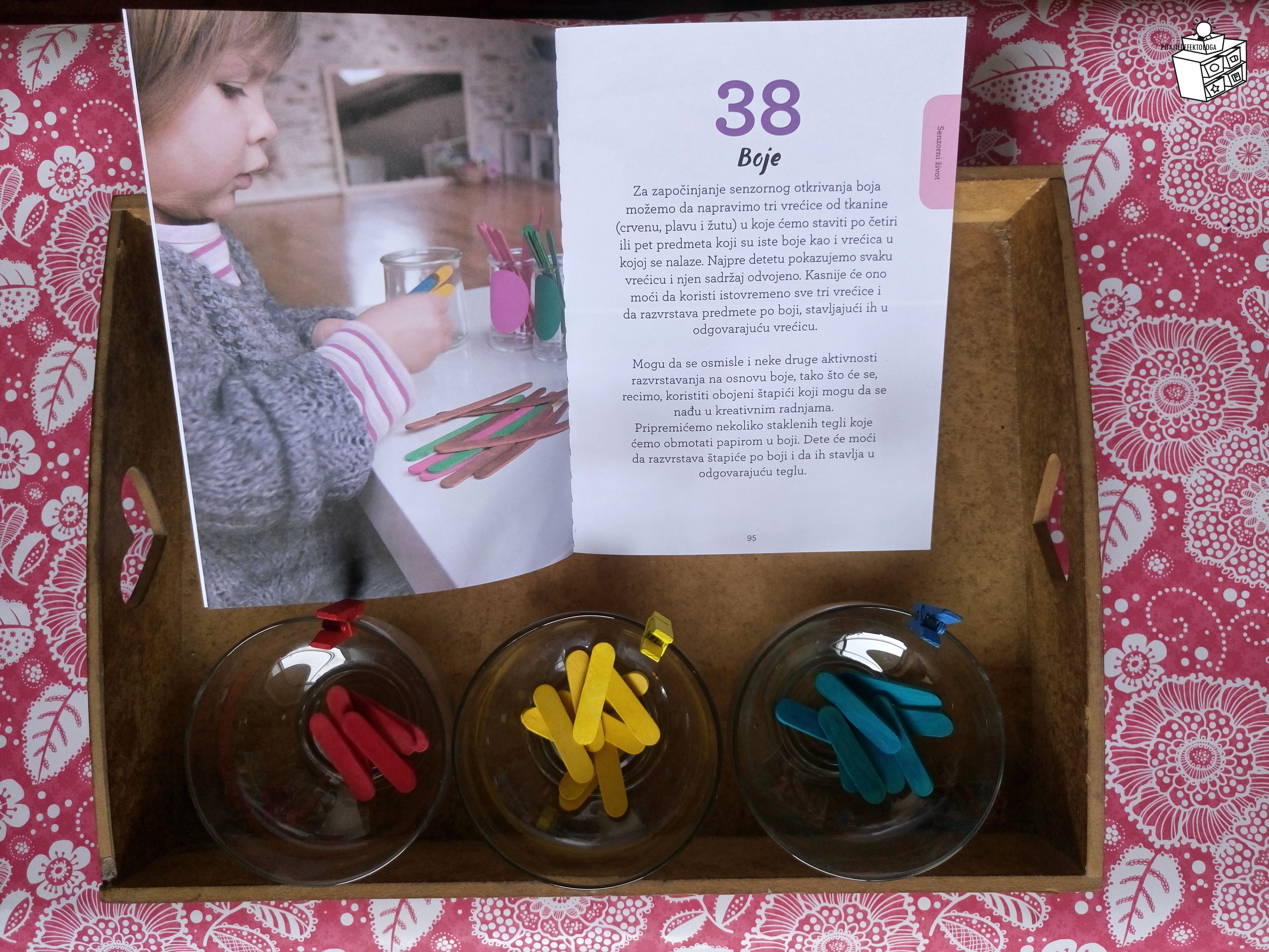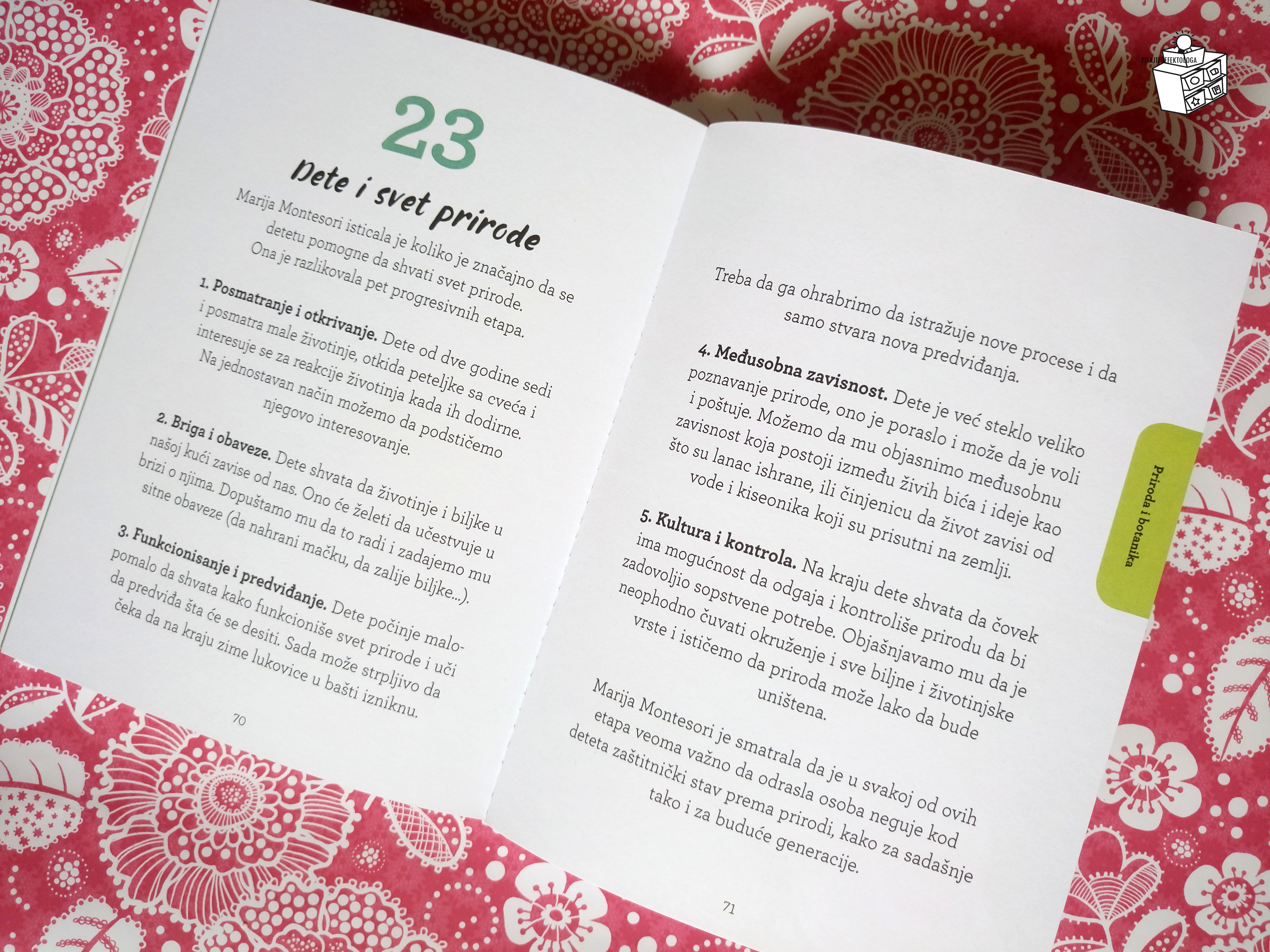 Jednostavan odgovor bi bio sve, ali hajde da objasnim šta je to sve. Svaka od knjiga dolazi sa stvarno 100 različitih aktivnosti koje detetu dalju ključ da otkrije svet. Na početku svake knjige možete pročitati o Montesori metodu i šta on predstavalja. A pre nego što krenem sa predstavljanjem prve knjige i njenog sadržaja želim da sa vama podelim deo aktivnosti 23 koji nosi naslov O REDU – Malom detetu je potreban red, sam koncept pravljenja reda stvara se između rođenja i druge godine života, a zatim nastavlja da se razvija. Detetu je red potreban kako bi moglo da pronađe smisao u svom okruženju.