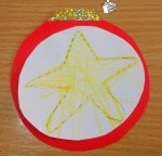 4. Od belog papira izrezati bele krugove i na njih nacrtati neki crtež – jelku, zvezdu, pahulju šta god dete želi – kako je ovo rađeno sa decom u vrtiću na belim krugovima iscrtala sam linije za spajanje kako bi se dobile različite slike (grafomotorička vežba). Crteže zalepiti na prethodno pripremljene kugle.