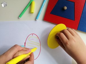Kada izvadite oblik iz njegovog polja, ocrtajte njegov okvir (na slikama iznad možete da vidite kako smo mi to uradili). Sklonite oblik i krenite da ispunjavate različitim linijama (grafomotornim nizom) unutrašnjost oblika, možete izabrati onu boju koje je boje oblik (na taj način proverite poznavanje i sparivanje boja). Šare kojim se ispunjava oblik mogu biti različite ravne i krive linije.