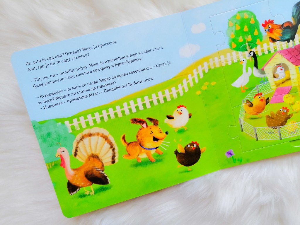 Slike sa farme je zabavna priča o psu Maksu koji je stigao u svoj nobi dom farmu i tu se upoznaje sa životinjama koje žive na njoj. Budi dečiju radoznalost da zajedno sa njim istraže farmu i da otkriju šta se to krije iza kućice, ko se to čuje u dvorištu, a istovremeno nudi priliku za razvoj igre imitacije.