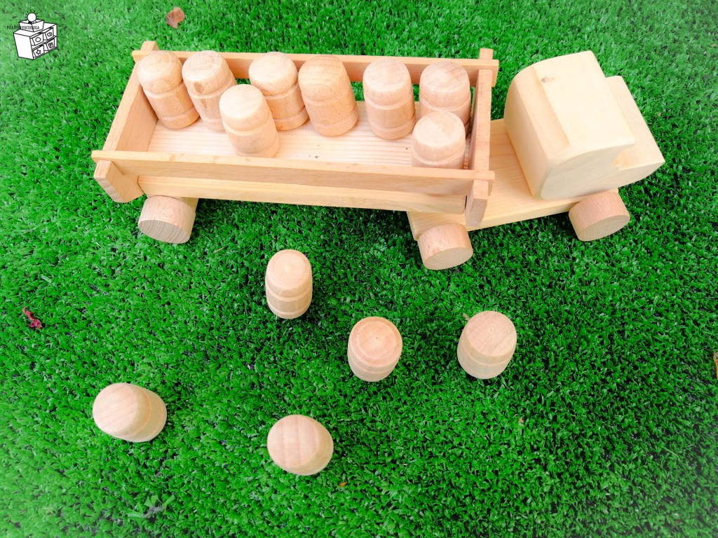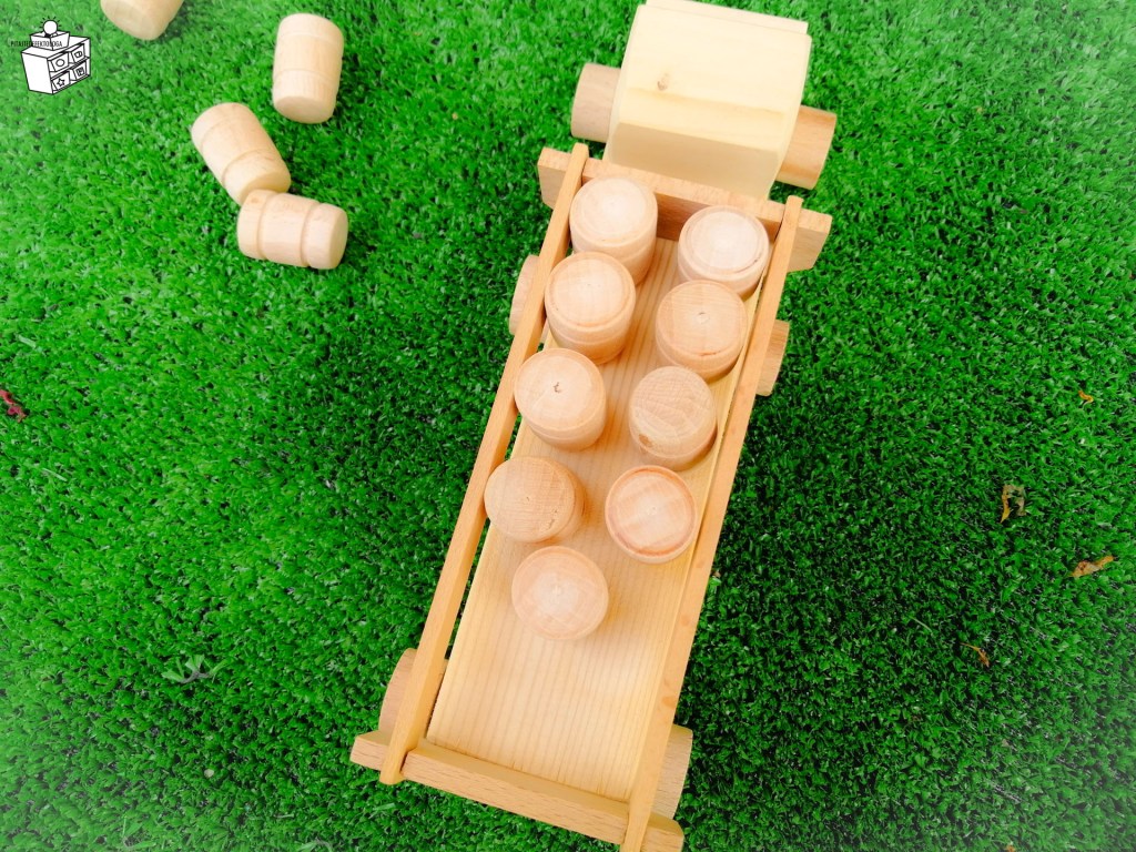 Za ovu igru koristila sam kamion sa buradima od Kockica Eco Toys, uz ovu igračku se dobija 13 buradi, ali ja koristim 10 (jer se kada pričamo o brojevima deci uvek nudi skup od 5 ili 10, jer su te količine uvek pred očima deteta – imamo 5 tj. 10 prstiju).