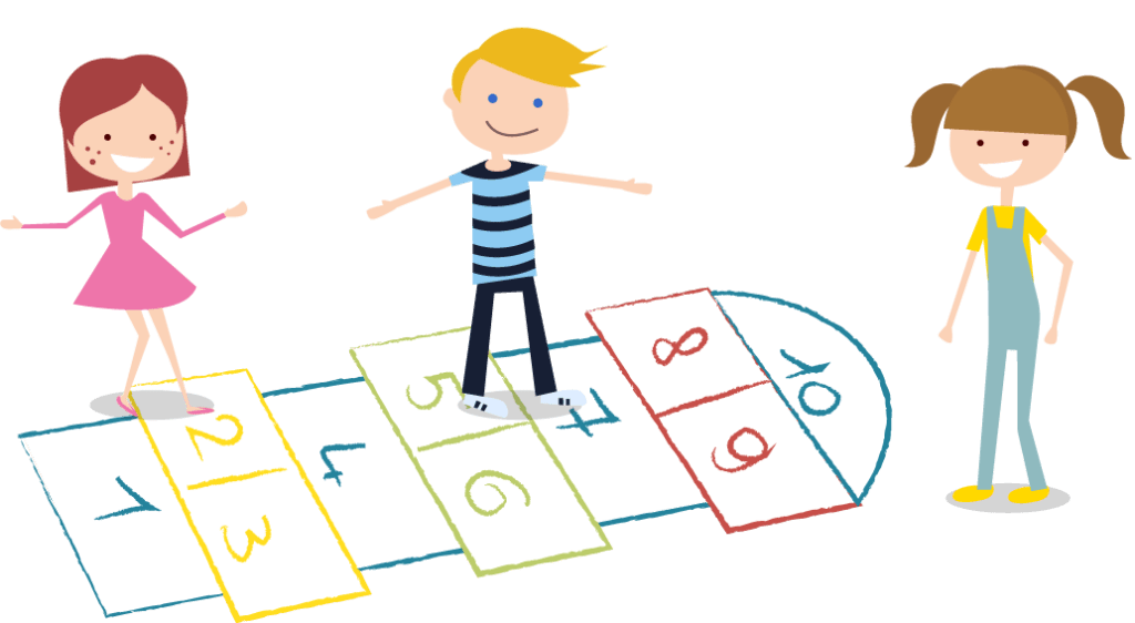 Školice – ko se još nije igrao u vrtićkom ili školskom dvorištu ove igre? Potrebna vam je kreda kojom ćete nacratiti polja na betonu od 1 do 10 i jedan kamečić. Dete baca kamenčić na jedno od polja i kreće da skakuće na jednoj nozi kada je jedno polje, odnosno da skoči sa raširenim nogama kada su polja jedna do drugog. Na onom polju na kom je kamenčić dete se saginje i uzima ga.