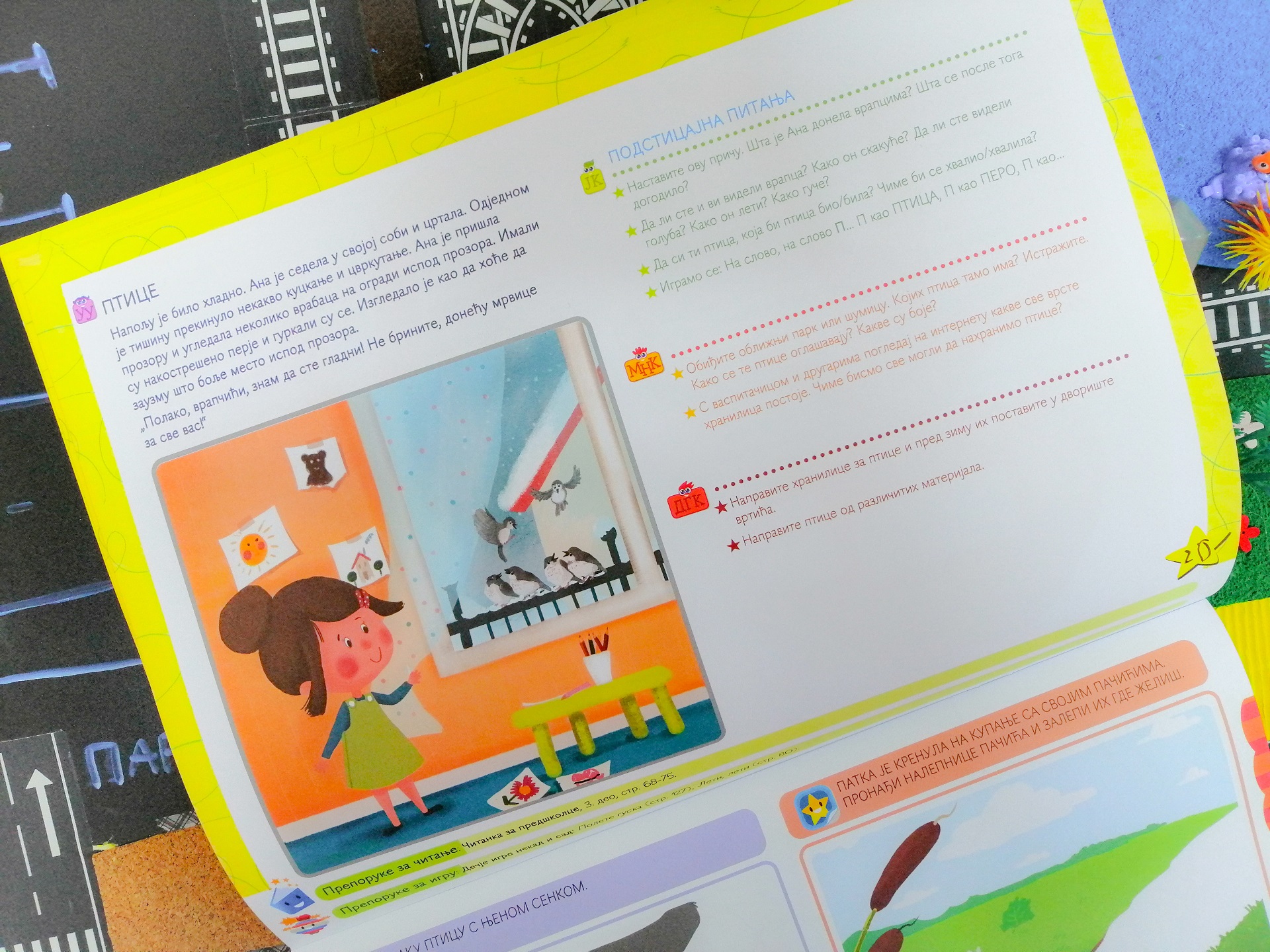 Istraživanje je najbolji pokretač za sticanje iskustva i učenje, te su osmišljeni zadaci takvi da su usmereni na dete i njegove potencijale. Opis vežbanke – “Dat je najširi izbor mogućih aktivnosti koje su u vezi s različitim aspektima dečjeg razvoja – od grafomotoričkog do jezičkog i logičko-matematičkog. Svaka priča i prateće aktivnosti i pitanja podstiču komunikaciju, promišljanje i istraživanje, a pored toga daju i dragocene smernice vaspitačima i roditeljima kada je reč o tekstovima za čitanje deci, kao i preporuke za igre koje mogu igrati s njima. Zadovoljena je i dečija potreba za igrom, komunikacijom i telesnim pokretom.”