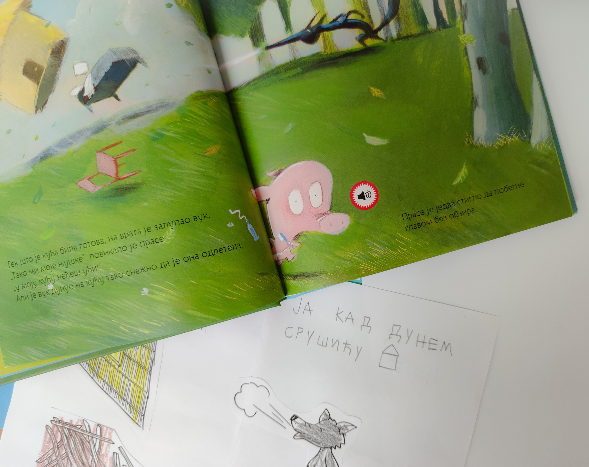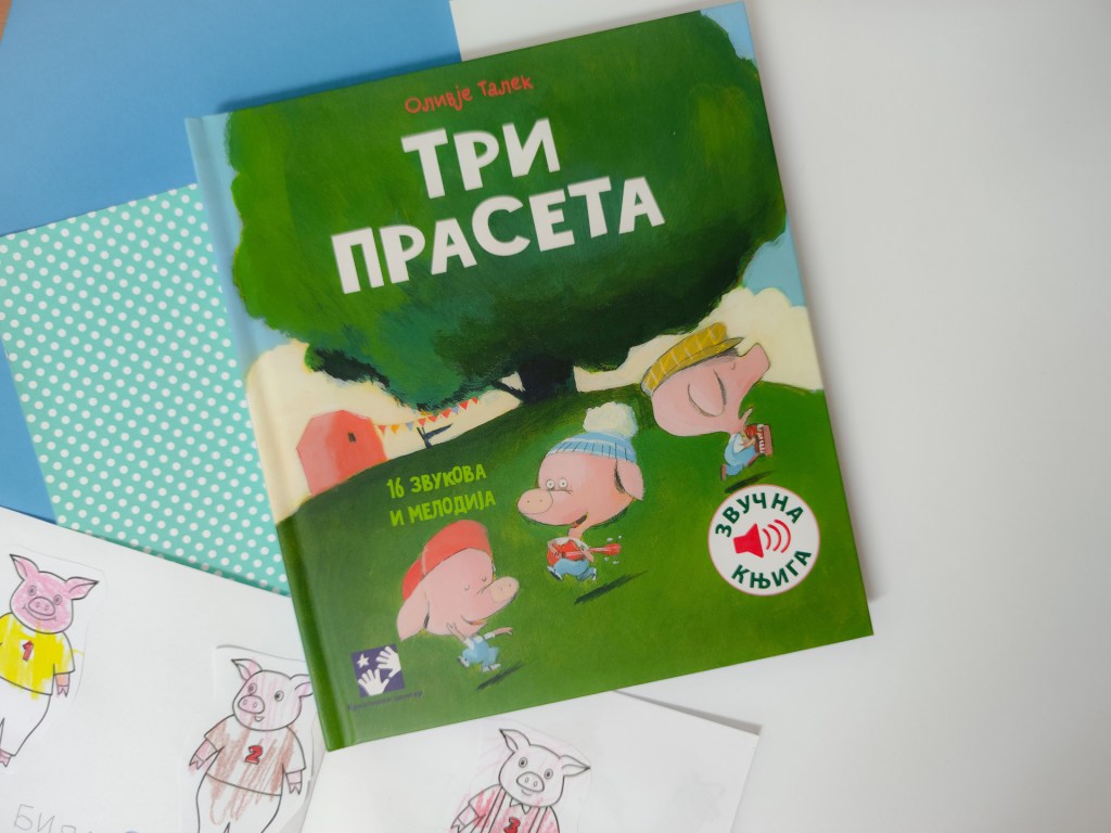 Pssst, ne morate samo da zamišljate, pomoć stvarno postoji, a to je zvučna knjiga “Tri praseta” u izdanju Kreativnog centra. Dok zajedno čitate ili pričate bajku o tri praseta, pažnju će dodatno održati zvuci iz knjige. Čućete tri praseta kako pevaju, sviraju, zvižduću, grade svoje kuće i beže od vuka, drvoseču koji seče drva, zadihanog vuka, vatru koja pucketa i radosnu pobedničku pesmu tri praseta.