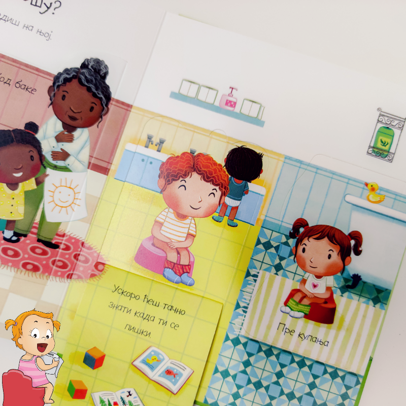 Koristite iste opise i reči kada govorite o upotrebi toaleta. Razgovarajte sa detetom na tu temu, koristite dečije knjige koje obrađuju temu korišćenja toaleta, kako bi razumelo da je to nešto što svi rade. Jedna od tih knjiga jeste ČEMU SLUŽI NOŠA, u izdanju Kreativnog centra.
