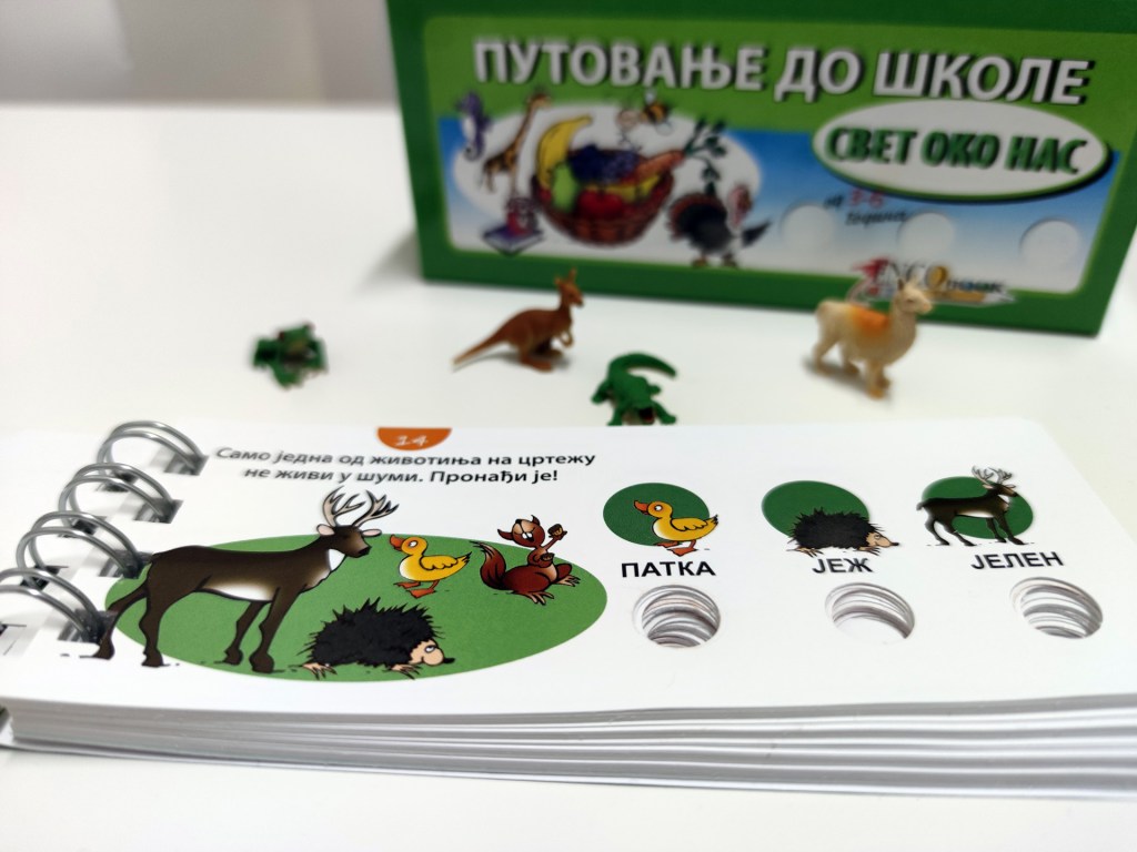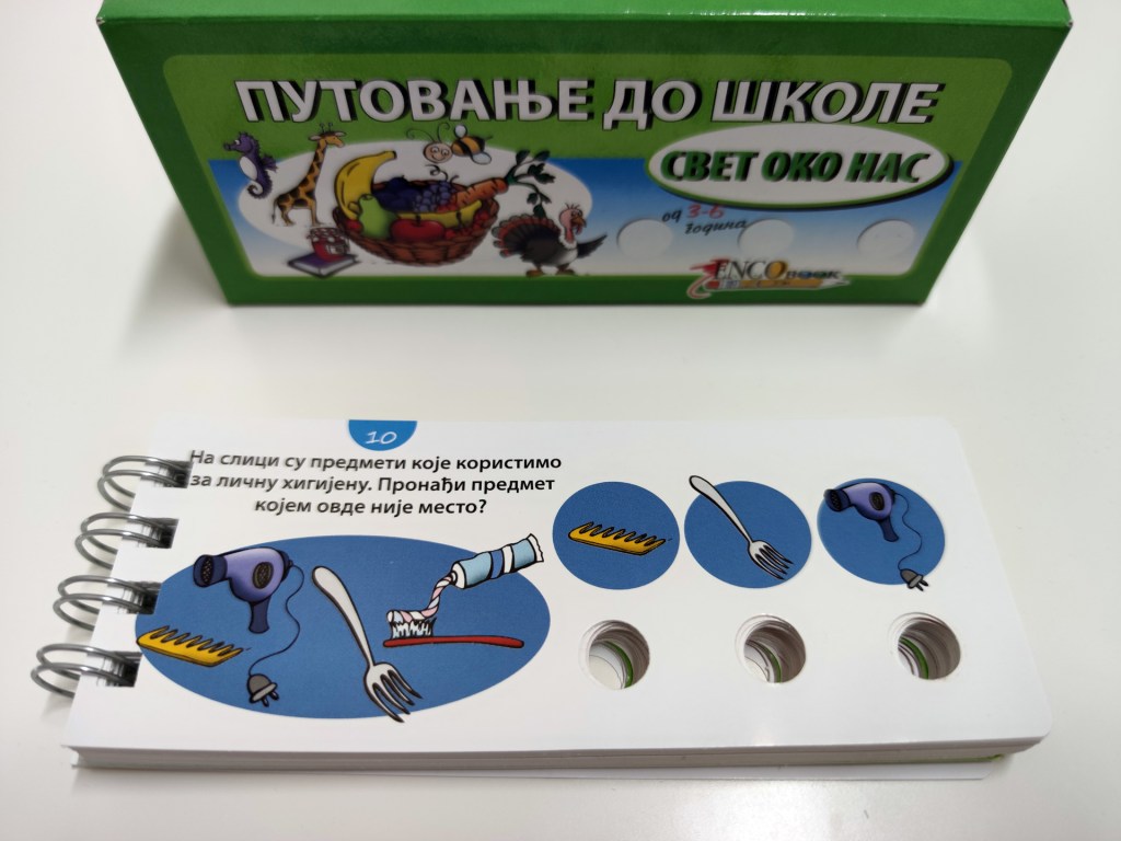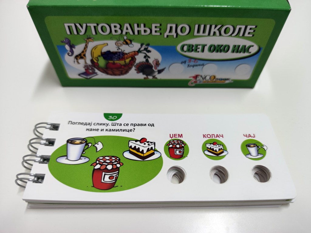 Razgovorom i igrom, kroz igru dete usvaja veštine i znanja koja su temelj za akademski uspeh. Uključivanjem deteta u rutine porodice dete usvaja znanja o svetu koji ga okružuje. A kao pomoć nam dolazi Putovanje do škole – Svet oko nas koje nam nudi pitanja čije bi odgovore trebalo budući prvak da zna. Format knjige je odgovarajuć da se ponese svuda, a rupice koje se nalaze ispod ponuđenih odogovora nude i priliku za vežbanje pokaznog gesta. Na poleđeni svake strane obeležen je tačan odgovor koji pruža priliku da dete samo proveri svoj odgovor.