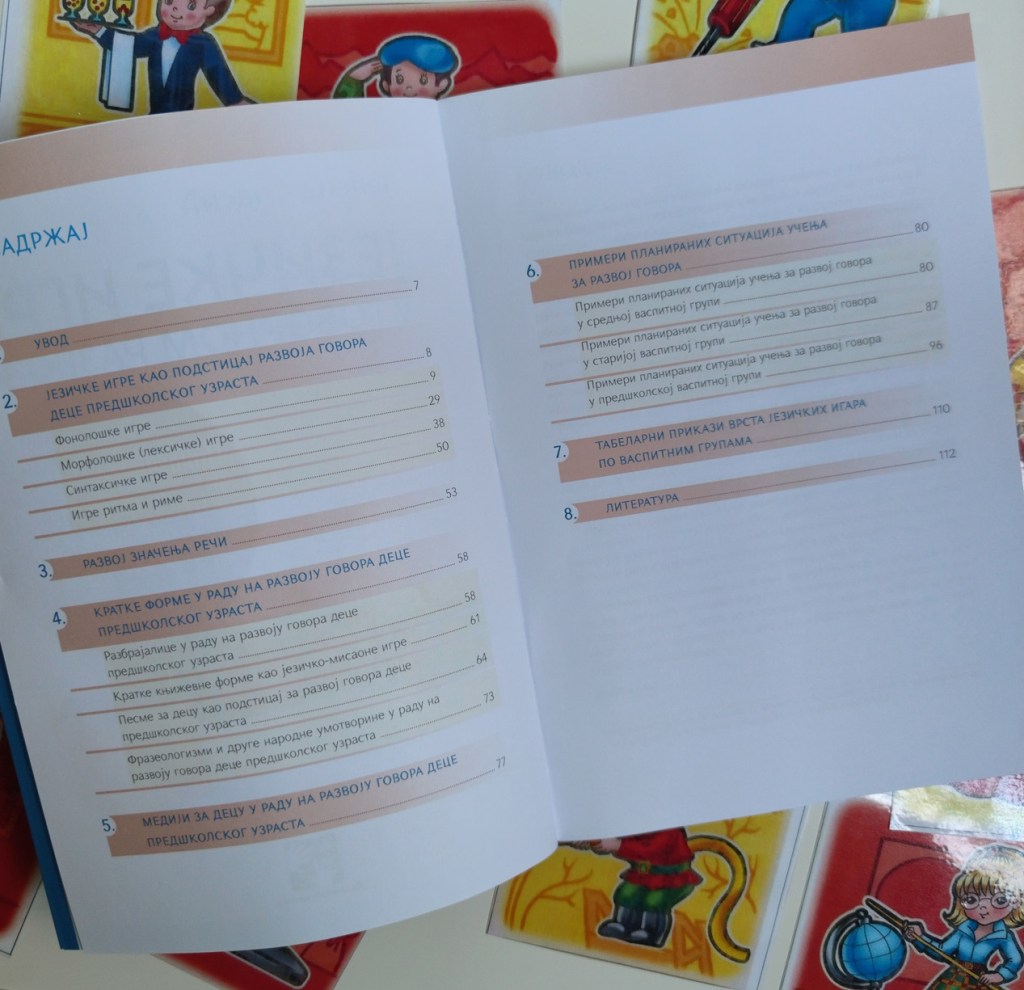 U knjizi su predstavljene različite fonološke, morfološke i sintaksičke jezičke igre, kao i igre ritma i rime. Osim jezičkih igara, u fokusu pažnje su i kratke književne forme koje svojim jezičko-stilskim odlikama pogoduju radu s decom predškolskog uzrasta. Na kraju priručnika dati su primeri planiranih situacija učenja za različite uzraste.