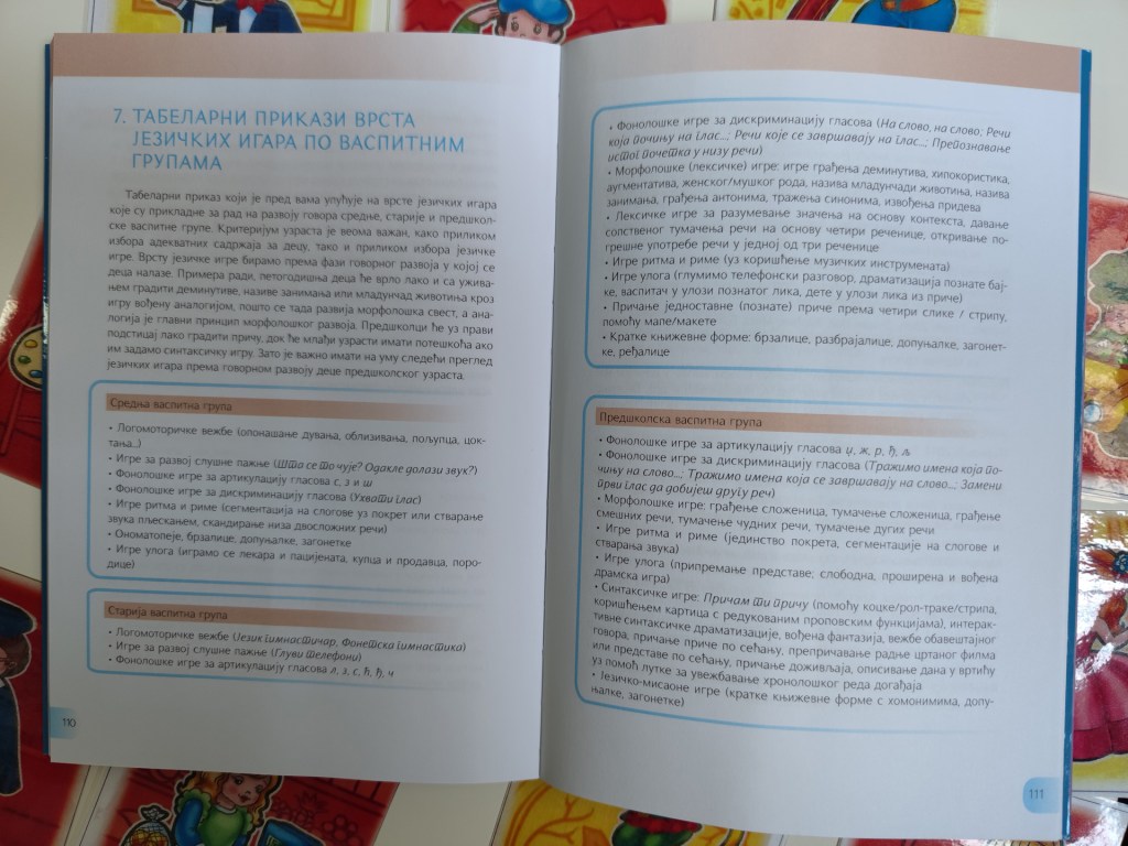 Ono što se meni dopalo u ovom priručniku jeste što se nude konkretni primeri koji se mogu spovesti u grupi, uz poštovanje principa jednostavnosti i prilagođenosti uzrastu. Pa tako već na početku se može videti tabelarni prikaz jezičkih igara koje se mogu sprovoditi u različitim vrtićkim grupama.