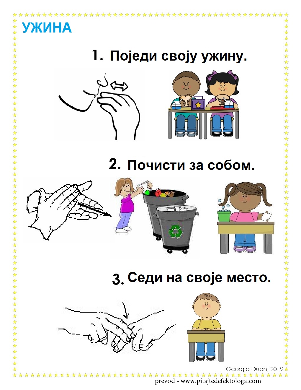 - UŽINA – ukoliko dete nosi užinu u školu spremite i vežbajte pravilno otvaranje i zatvaranje činija. Napravite vizuelni podsetnik sa ilustracijama ili fotografijama ukoliko je to potrebno.
