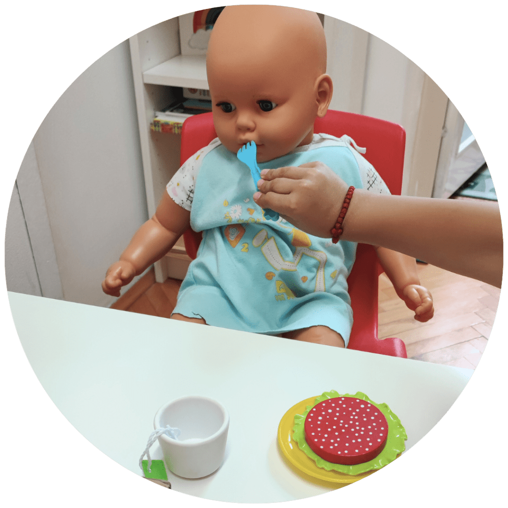 Počinje igra sa lutkama i životinjama kao da su stvarne, te se slon stavlja u krevet da spava, lutka je gladna i mora se brzo nahraniti,…